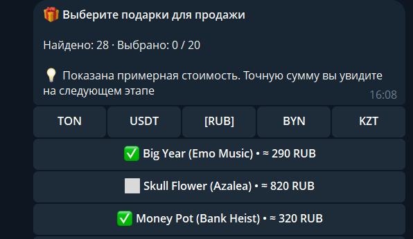 - ❌ Обычные подарки: Стандартные неколлекционные подарки без уникальных характеристик. К сожалению, их продать нельзя.
