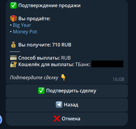 - Завершите сделку: Если цена устраивает, нажмите «Согласен на сделку», укажите реквизиты и перешлите подарок оператору.