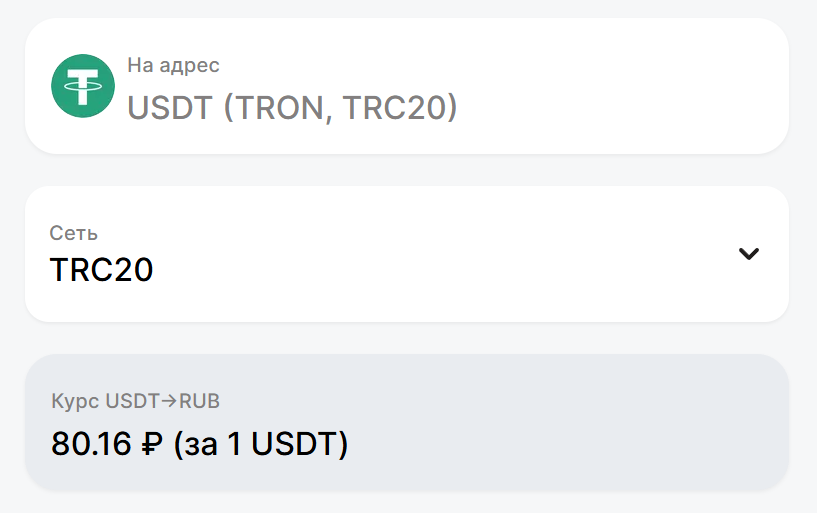 На момент написания: курс 80,21 ₽, комиссия в TRC20 — 3 USDT